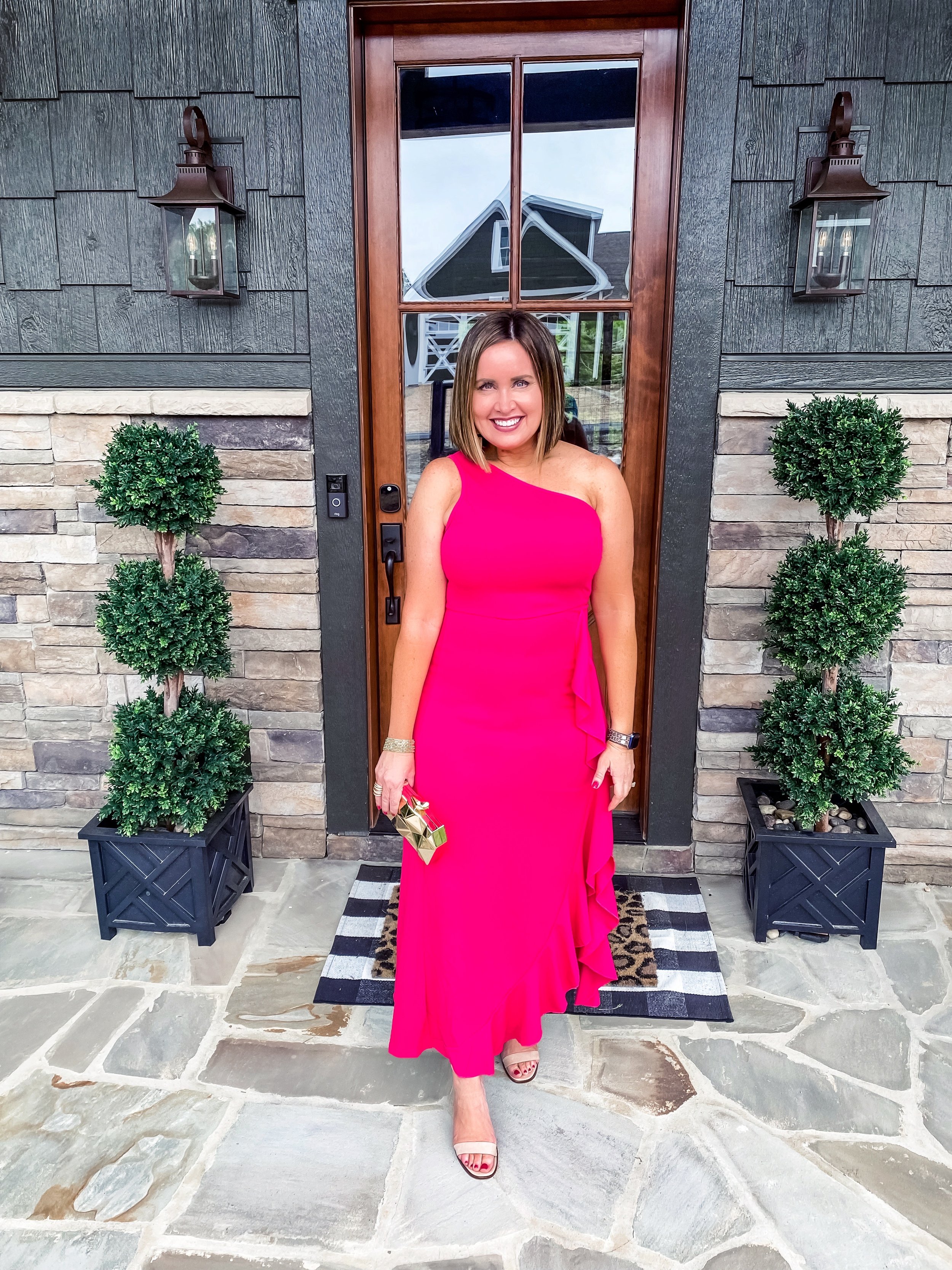 ONE SHOULDER WEDDING GUEST DRESS (true to size, medium) // GOLD CLUTCH PURSE