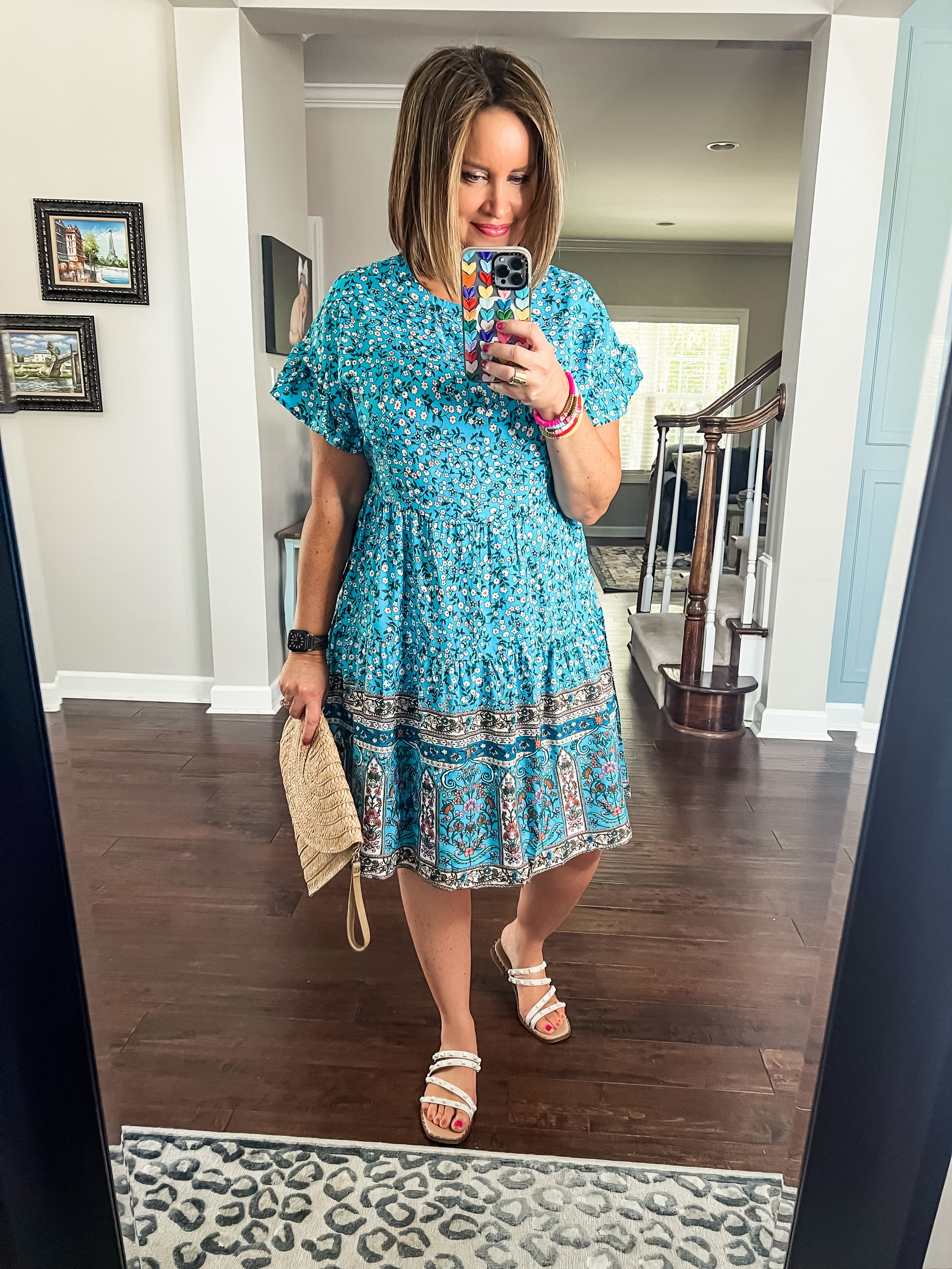 BLUE FLORAL DRESS (true to size, medium) // STRAW CLUTCH PURSE