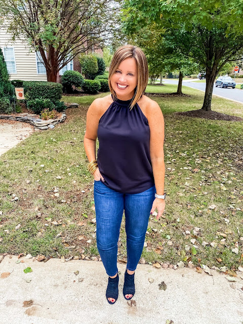 This HALTER TOP is great for date night. Pair it with black jeans for a more casual look or with a BLACK MIDI SKIRT for a dressier look. If you prefer a shorter skirt, I love this BLACK PENCIL SKIRT. I paired this outfit with some BLACK SANDALS (similar to mine) & it would also look cute with BLACK BOOTIES. The top and skirt both run true to size.
