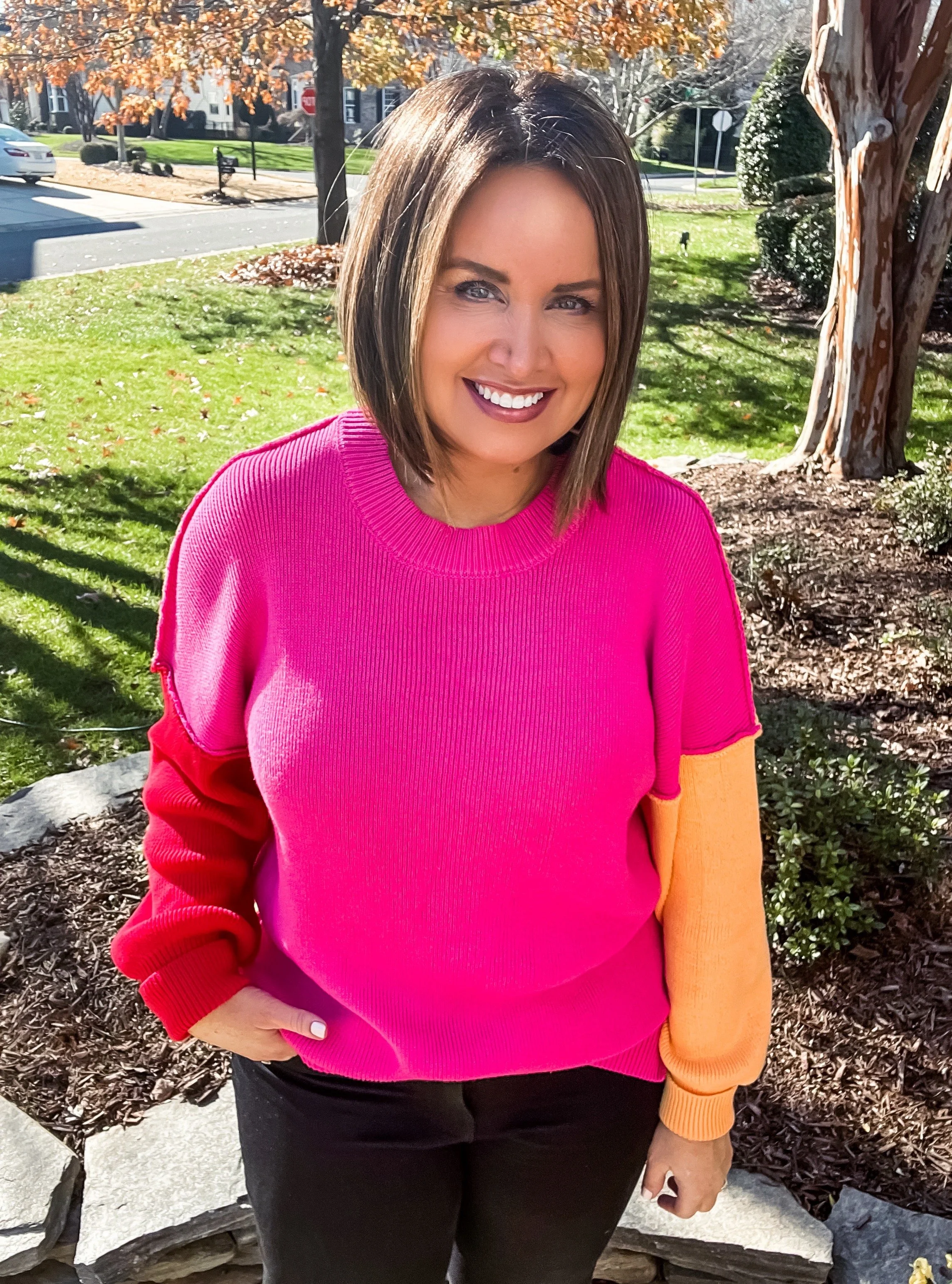 COLORBLOCK SWEATER - I have worn this sweater a bunch since I bought it. I love the color combo and the oversized fit. It also comes in several other fun patterns. The sweater has an oversized fit. I sized up to a large, but wish I ordered my regular size medium. I recommend sticking with your regular size and you will still have an oversized fit.
