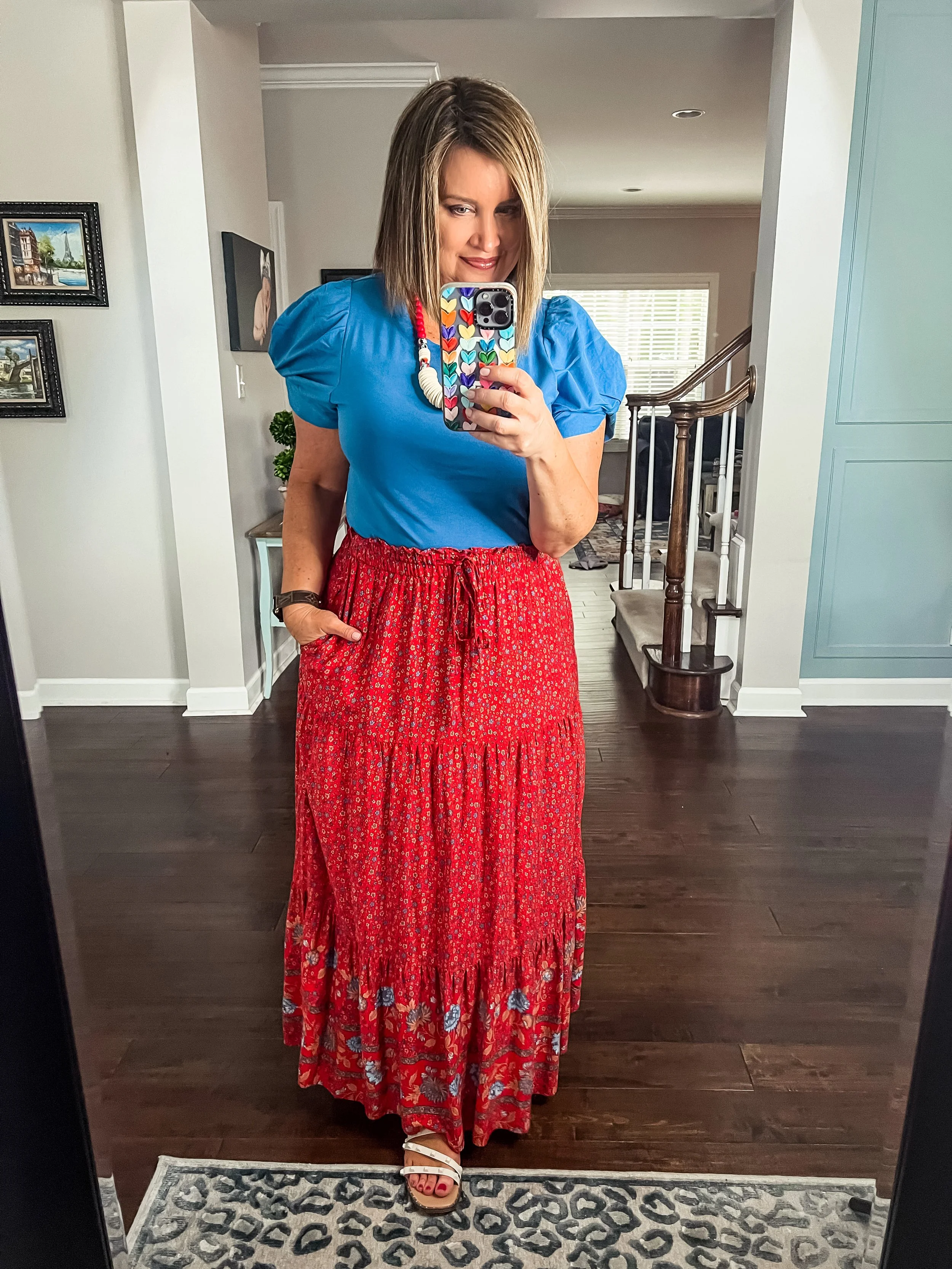 MAXI SKIRT - I love this skirt so much I have it in 2 prints. This red is perfect for Memorial Day or July 4th. Skirt runs true to size and I am in a medium.