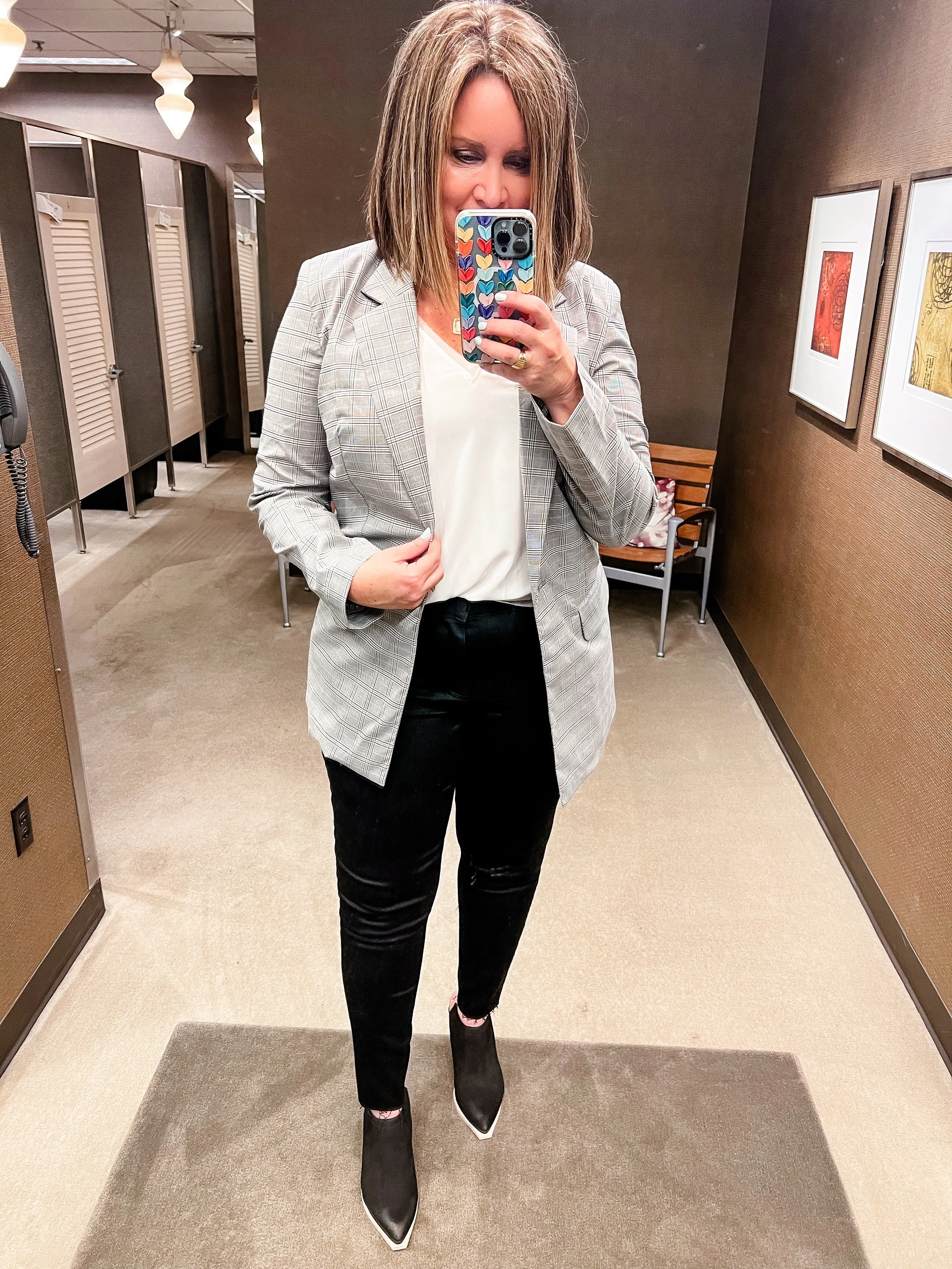 GREY PLAID BLAZER - I love the longer length of this blazer and the light grey plaid will go with so many different colors. It runs true to size.
