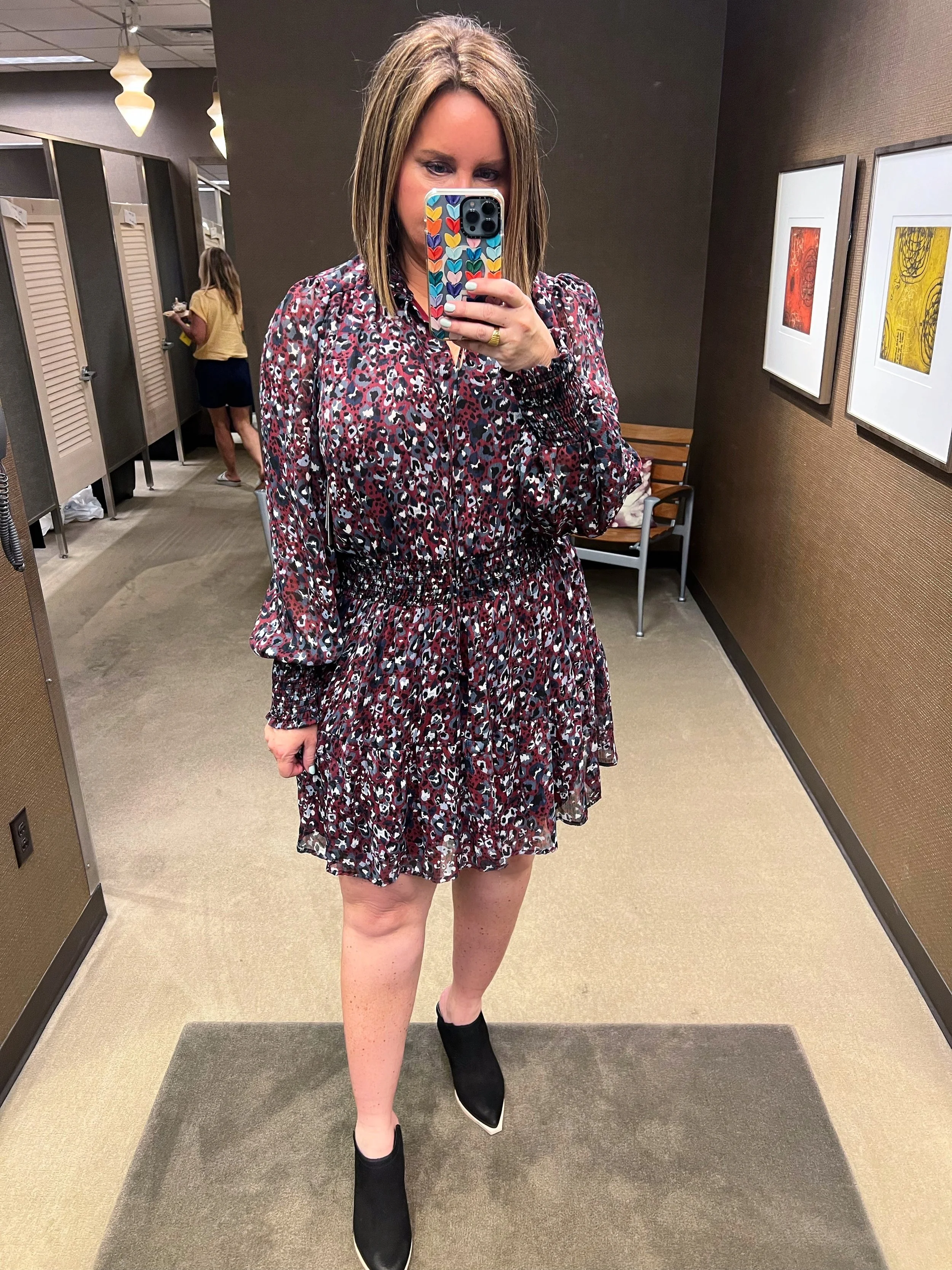 SMOCKED WAIST DRESS - The print on this dress is perfect for fall. The wide smocking at the waist and wrists gives it a comfortable fit. This dress hits about 3 inches above my knees (I am 5’5”). It runs true to size.