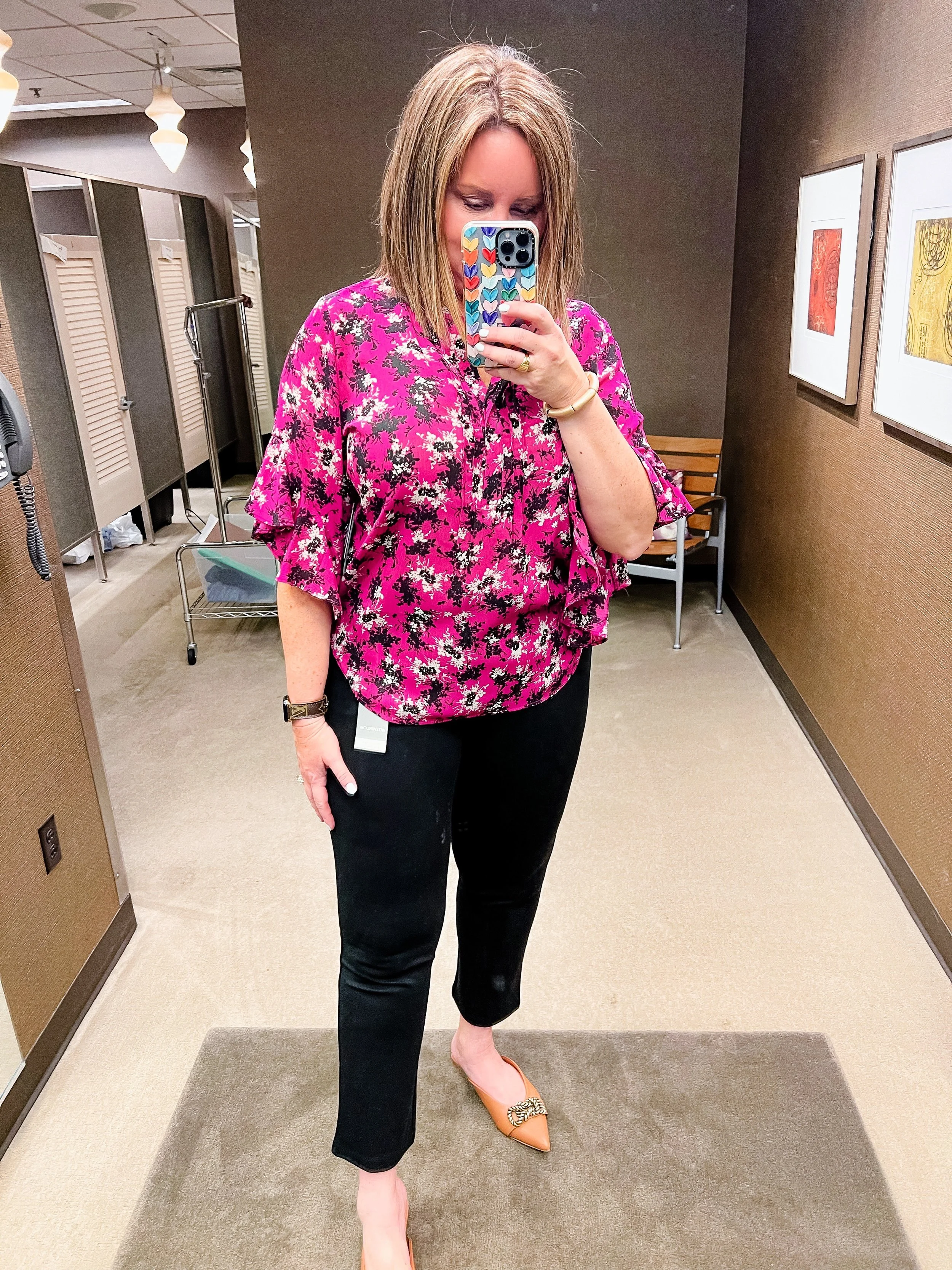 V-NECK SHELL BLOUSE - This versatile piece is perfect under blazers and cardigans. It also comes in a few other solids as well as some prints. I recommend sizing up if you are in between sizes or busty.
