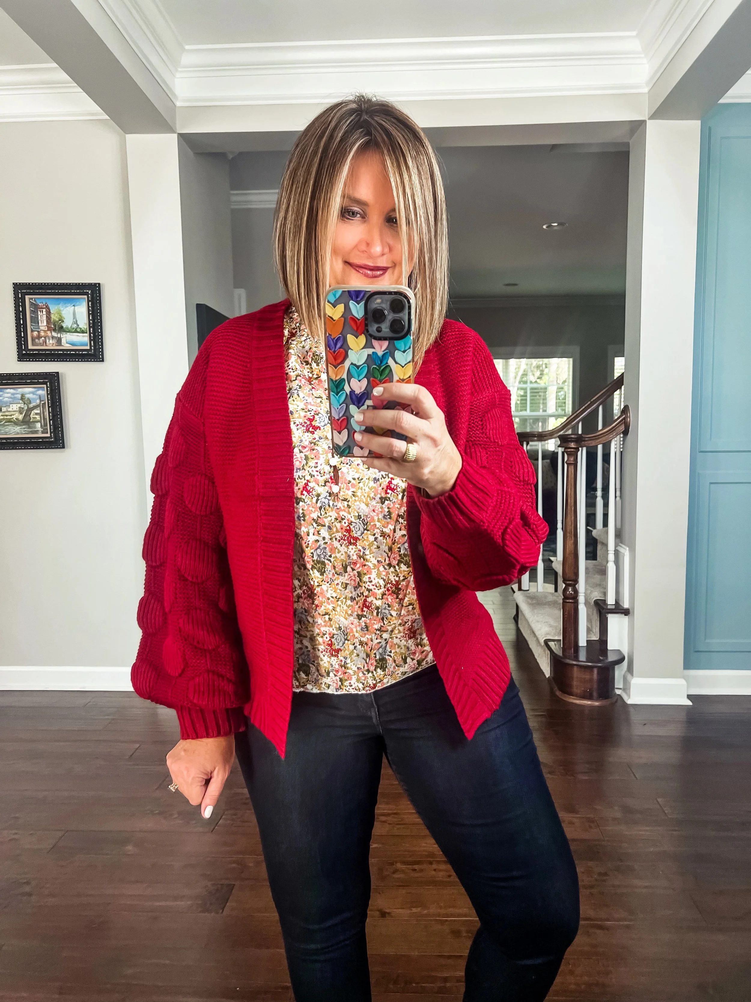 CARDIGAN SWEATER - The blousy sleeves on this sweater are so fun! This cardigan comes in several colors and is priced under $40. It has an oversized fit, but I recommend sticking with your regular size. I am wearing the “wind red” color. It is a bit more burgundy than it appears in this photo.