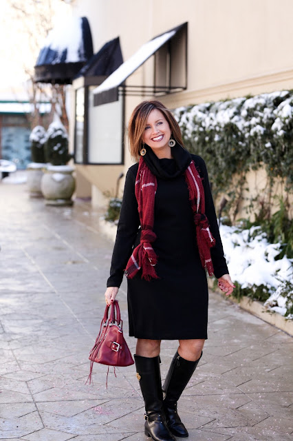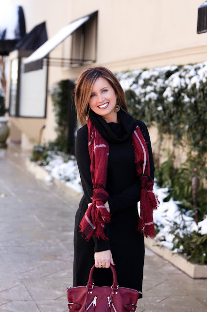For those of you who may not be a fan of wearing red or pink clothes, there is still a way to add these colors to an outfit for Valentine’s Day. I added a burgundy scarf and bag to this basic black dress to add some color. You could easily take a black dress or top in your closet and add a colorful red or pink scarf and you are ready to go. I have linked a few scarf options above.